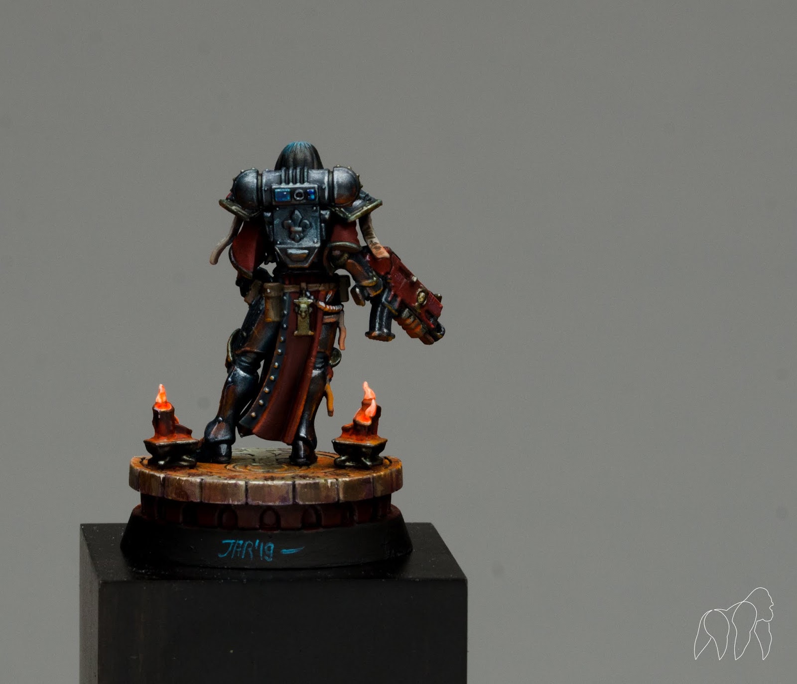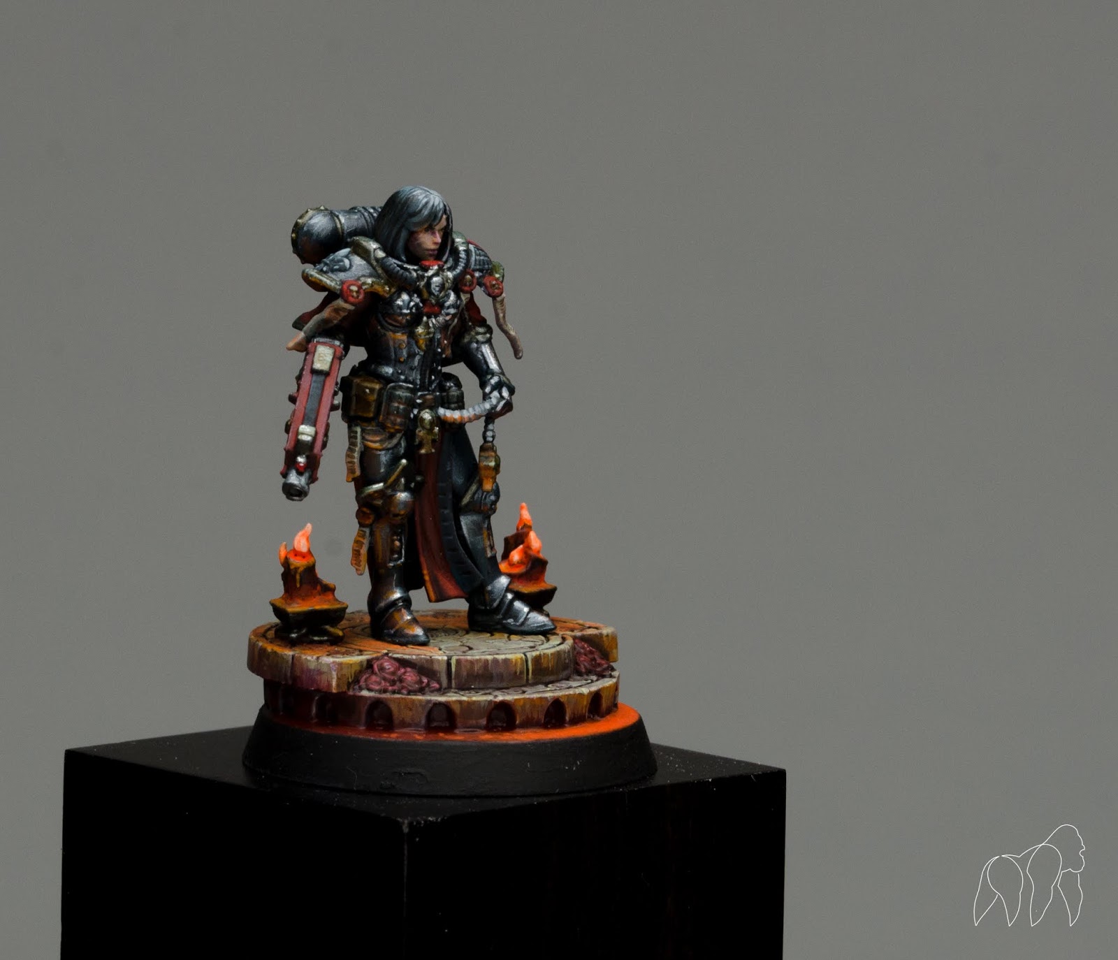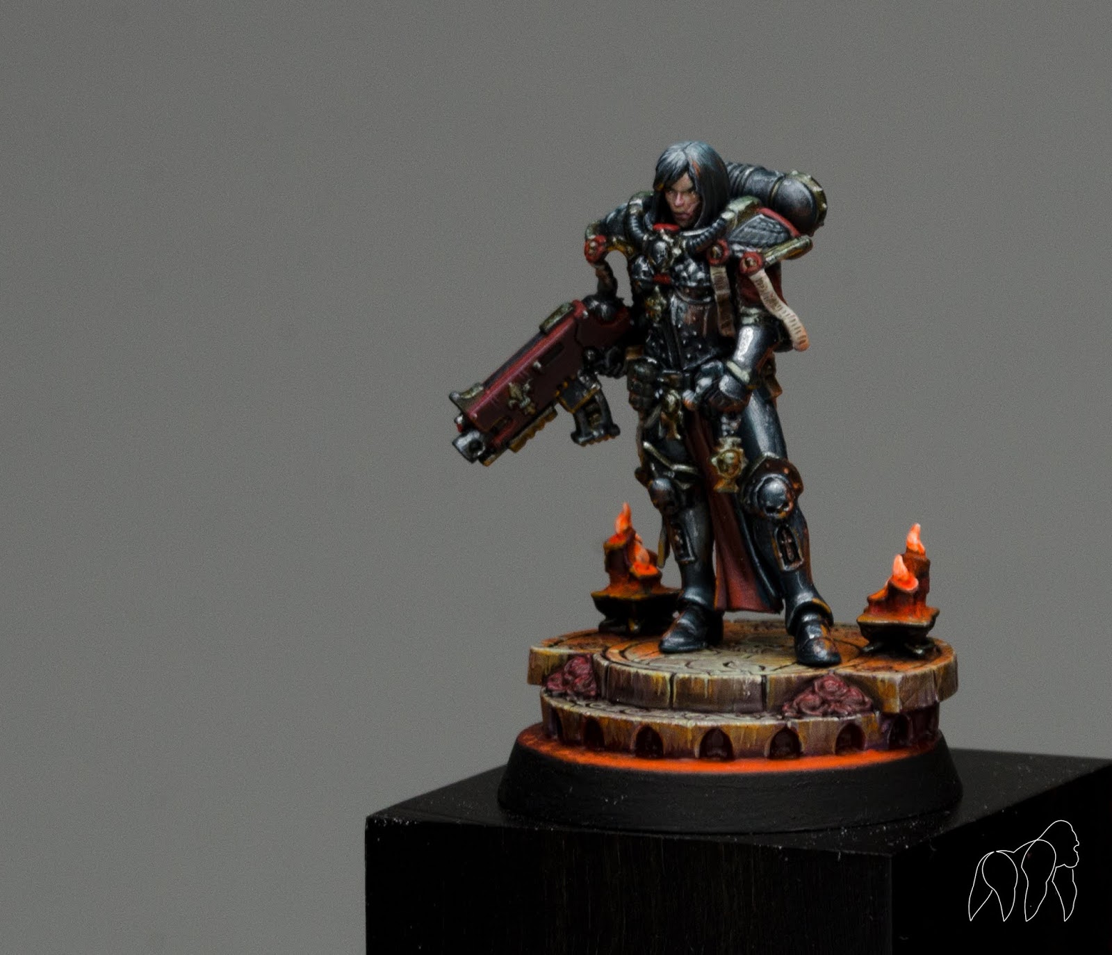Сестра битвы в исполнении Романа не выделяется яркими красками, украшениями и золотом. Доспех, расписанный в технике ТММ, выглядит побывавшим во многих сражениях. Приглушенные оттенки оружия и экипировки подчеркивают его блестящие элементы, а также помогают сконцентрировать внимание зрителя на лице героини. По той же причине волосы сделаны не белыми, как предполагает концепт GW, а воронено-черными, под базовый цвет доспеха.